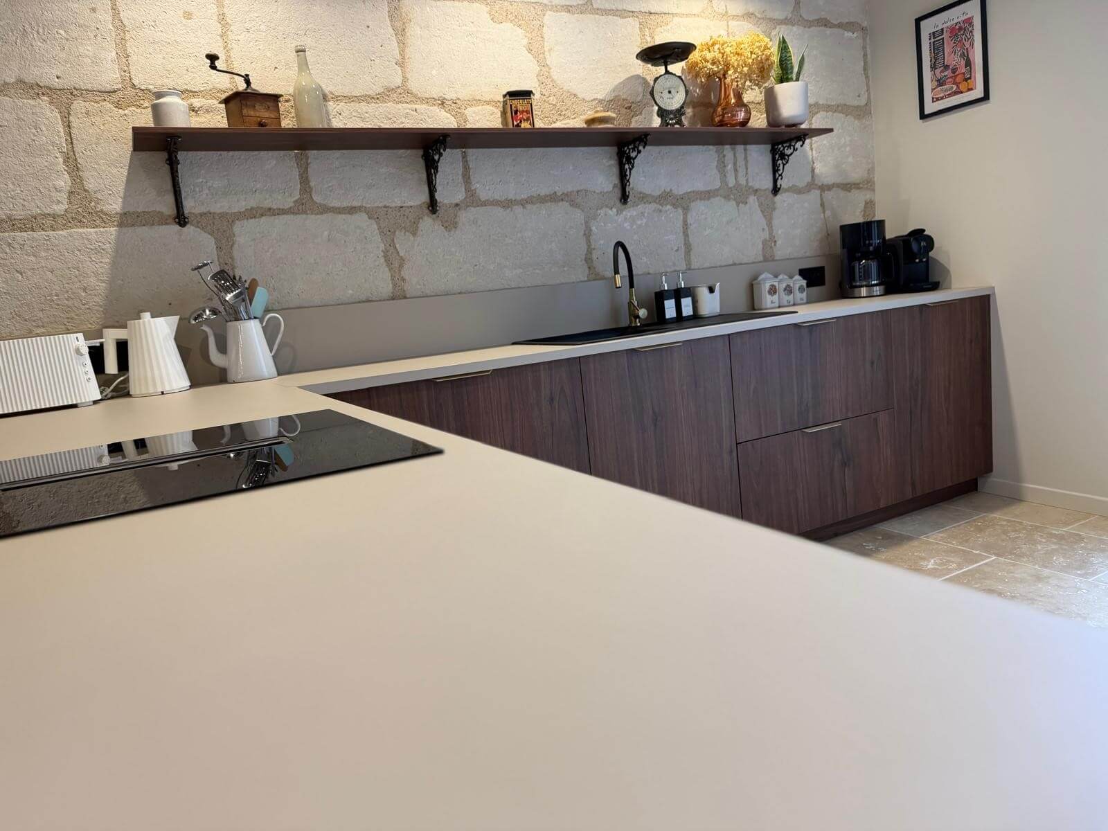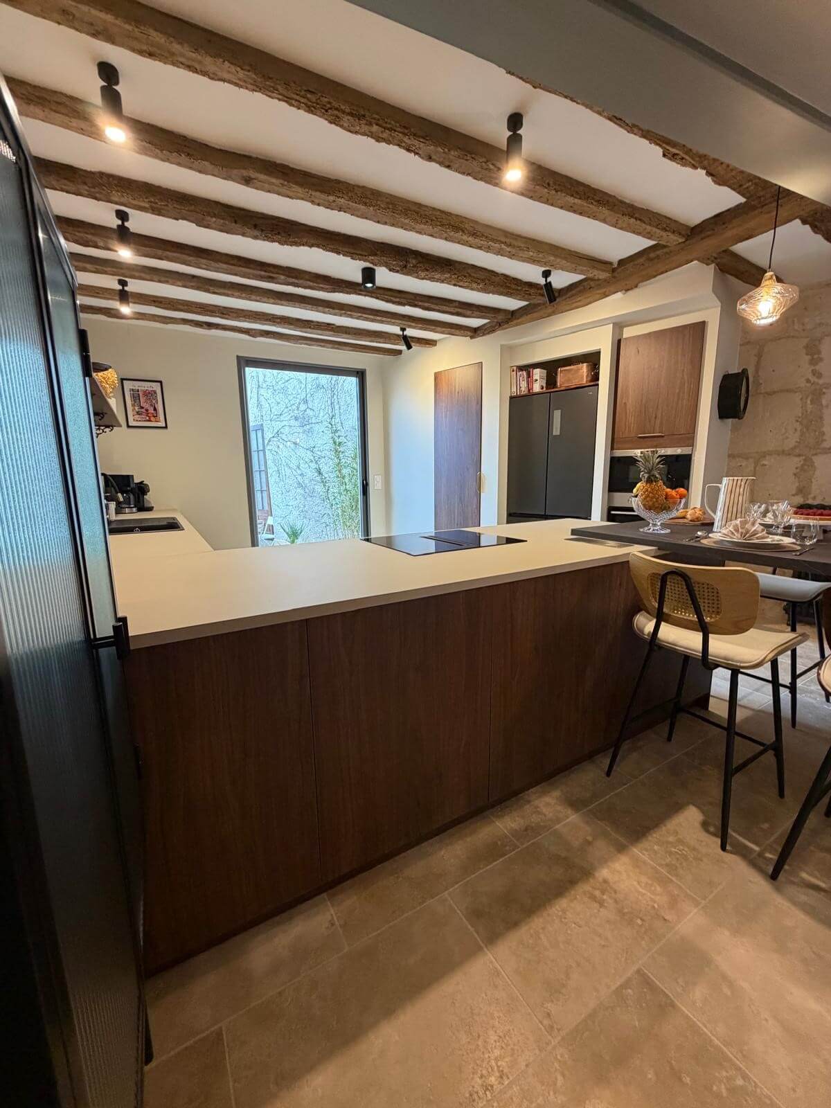 La chaleur et l’élégance du noyer ont été déterminantes dans le choix des finitions de cette cuisine. Ce matériau naturel, associé à un plan de travail blanc, crée un équilibre visuel qui confère à l’espace sophistication et caractère. Cette cuisine est bien plus qu’un simple lieu de préparation des repas. Elle devient un espace où la famille se réunit, où les enfants jouent et où l’on partage des moments de calme, offrant un environnement polyvalent qui reflète le rythme et les besoins de ceux qui l’utilisent. Chaque élément favorise la fonctionnalité, la praticité et une circulation fluide afin d’optimiser l’ergonomie de l’espace.