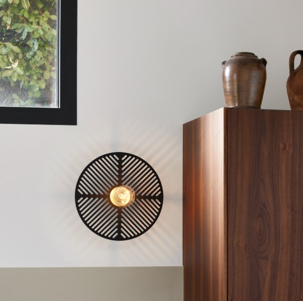 Applique murale de la collection Waterlily éditée par Market Set, composée d’une base murale cylindrique et d’un abat-jour rond et métal ajouré.