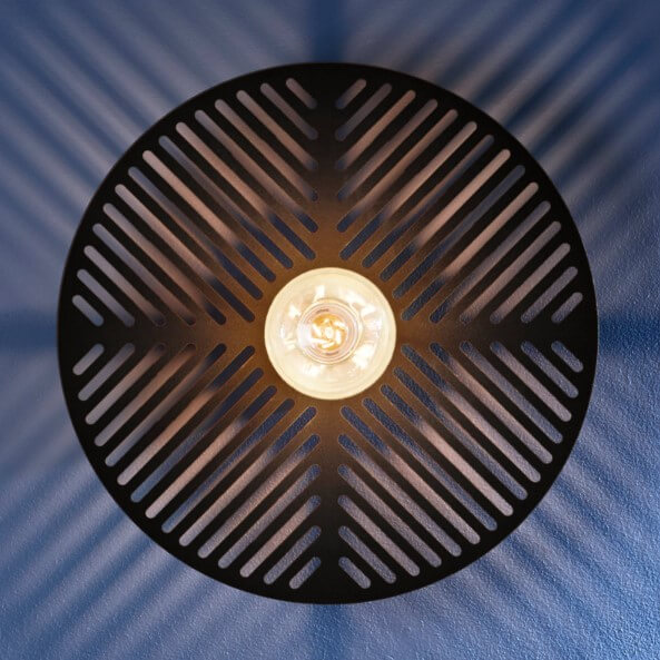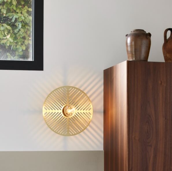 Applique murale de la collection Waterlily éditée par Market Set, composée d’une base murale cylindrique et d’un abat-jour rond et métal ajouré.