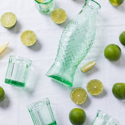 La créatrice Paola Navone a pour habitude de s’inspirer de ses voyages et de son goût pour la culture d’autres pays pour élaborer de nouveaux projets. Avec Fish & Fish, elle s’intéresse aux articles produits pendant la grande dépression des années 30 aux Etats-Unis. C’est à Sandwich, Massachusetts, que se développe pendant ces années de crise une vaisselle utilitaire en verre moulé, qui revêt principalement 3 couleurs : vert jade (Jadéite), transparent (Depression glass) et blanc (Milk glass). Bon marché, résistante et bien conçue, cette verrerie très répandue dans les foyers américains de 1930 à 1950 est aujourd’hui prisée de nombre de collectionneurs. Paola Navone lui redonne vie avec cette collection ‘Fish & Fish’, qui se décline en assiettes, verres, bocaux, carafes, plats, plateaux et accessoires, le tout en forme de poisson et estampillé ‘Herring bar’. On aime cette collection ludique, rétro et ultra moderne à la fois.