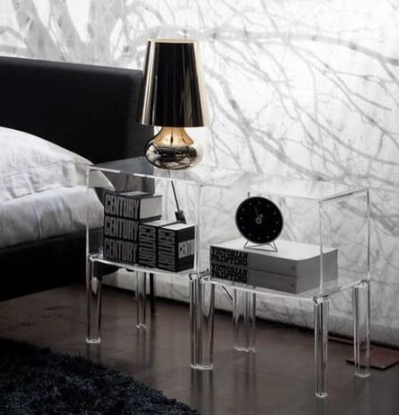 Un petit cube carré supporté par quatre pieds, réalisé en plastique et disponible en version entièrement transparente, colorée ou mate utilisable à l’intérieur.