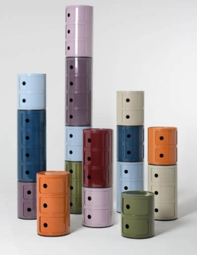 C’est en 1968 que la designer Anna Castelli Ferreri, épouse du fondateur de Kartell, crée le célèbre Componibili. Ce cylindre en plastique moulé avec ses lignes sobres et fonctionnelles est un symbole de la rupture qui s’est opérée dans le design au cours des années 1960. Pop, démocratique, accessible audacieux, pratique, modulable : ce petit meuble répond pleinement au besoin d’une nouvelle société qui se dessine.