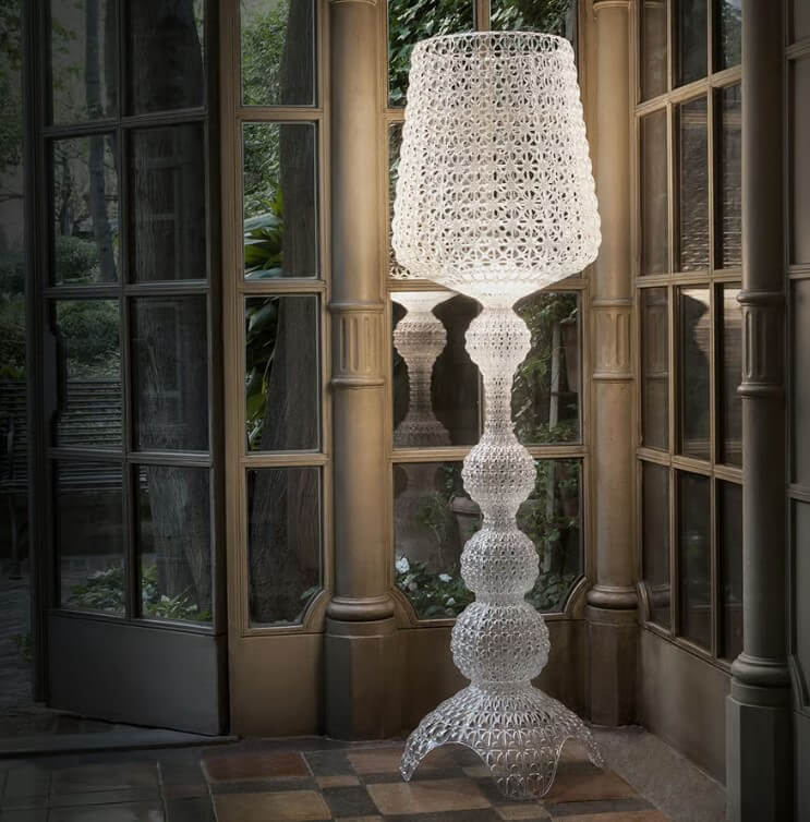 Séduisante et féminine, cette lampe aux courbes sensuelles est habillée de dentelle de la tête aux pieds ! Avec ses formes travaillées et sophistiquées, le lampadaire Kabuki affiche un style baroque revisité par le matériau plastique ajouré. Cette précieuse résille aux motifs délicats joue avec la transparence et la lumière, donnant naissance à de superbes projections d’ombres. Malgré des lignes massives, la silhouette de Kabuki est éthérée, légère, délicate, presque impalpable… La finesse des motifs, la richesse du travail des entrelacs sont obtenus grâce à un procédé industriel complexe qui évoque la technique artisanale du crochet. Kabuki nous fait découvrir le plastique sous un aspect totalement inédit et novateur ! La richesse du façonnage revêt un aspect précieux et ‘’fait main’’.