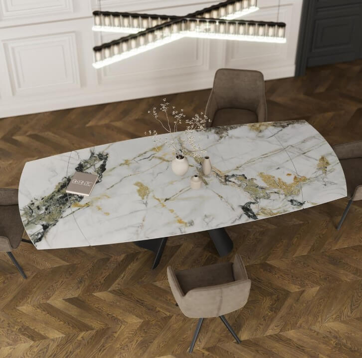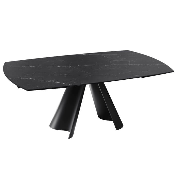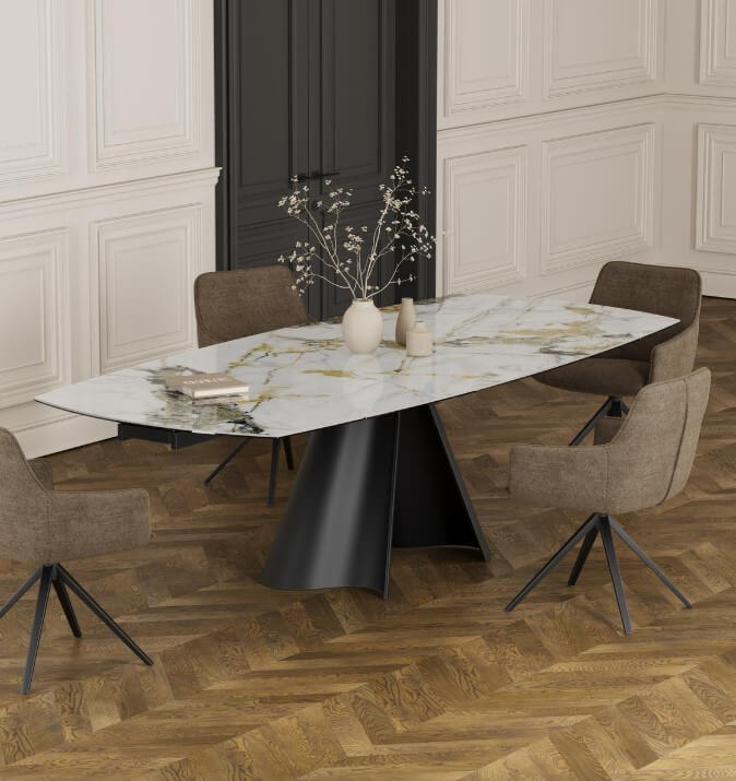 Grâce à son plateau en céramique, cette table offrira une ambiance cosy et douce au cœur de votre salle à manger. Fermée, elle mesure 150 cm, vous pouvez l’agrandir jusqu’à 230 cm et déployer ses deux rallonges à chaque extrémité en faisant simplement pivoter son plateau central. Son piétement original en acier laqué noir mat est parfait pour apporter une touche design et moderne dans votre intérieur. Le plateau de la table existe en plusieurs céramiques. Sa céramique, en provenance d’Espagne, mesure 3 mm d’épaisseur et est collée sur un verre de 8 mm pour garantir une table stable, facile d’entretien et réellement solide.