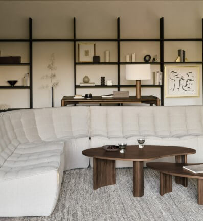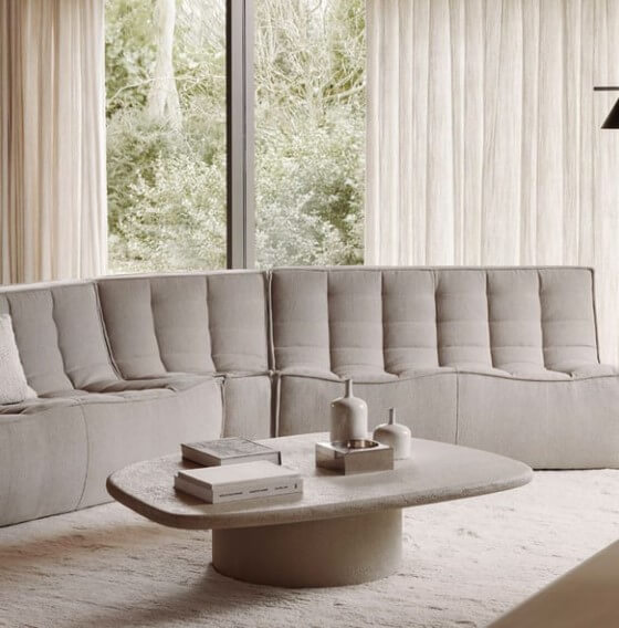 Cet assemblage de formes pures et massives relève d’une esthétique primitive qui trace un trait d’union entre le présent et le passé. Les lignes courbes et douces établissent une rupture avec les environnements très stricts et linéaires qui composent notre quotidien. La pureté géométrique de la forme est sublimée par la tactilité du matériau.