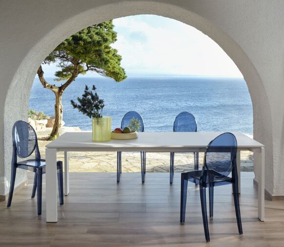 Une table fonctionnelle et raffinée au design géométrique rigoureux. Grâce à la solution de design élégante, le plateau fin semble littéralement flotter dans l’air, ce qui permet de positionner facilement des tiroirs et des éléments de rangement pour les postes de travail informatiques. Ils peuvent être placés côte à côte et être utilisés pour former des îlots de travail dans le bureau. Four est disponible en deux versions : la première FIXE, pratique et informelle, présente la structure en acier peint surmontée d’un plateau en stratifié d’une épaisseur de 2,5 cm. La seconde, extensible, qui trouvera sa place dans n’importe quel environnement. Avec cette innovation signée Kartell, les tables FOUR s’adaptent encore mieux aux besoins dynamiques des espaces contemporains. C’est une solution pratique et stylistiquement parfaite pour les réunions, les dîners et les moments conviviaux. Les tables sont disponibles dans des versions avec des pieds en acier peint et un plateau stratifié soft Touch de longueur 160+50+50. Four est disponible en blanc, noir.