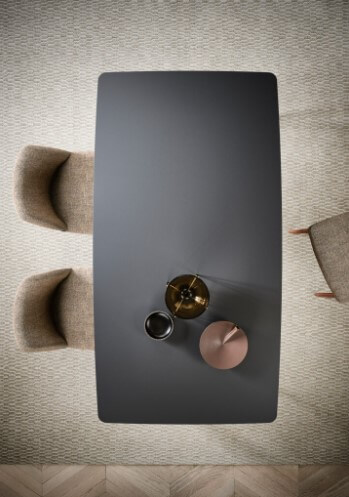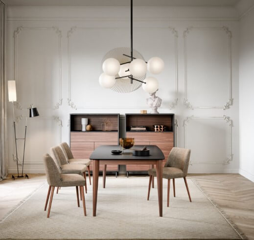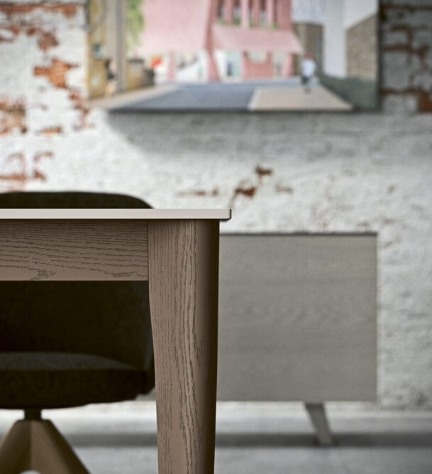 Table carrée, rectangulaire, ronde, ovale ou courbe (fixe ou extensible) en chêne ou noyer massif, avec des pieds fuselés et arrondis, assemblés par des tourillons et collés ; plateau personnalisable avec différents matériaux et finitions (sur demande, avec découpe à 45°). Plateau en bois, fenix, hpl ou céramique.