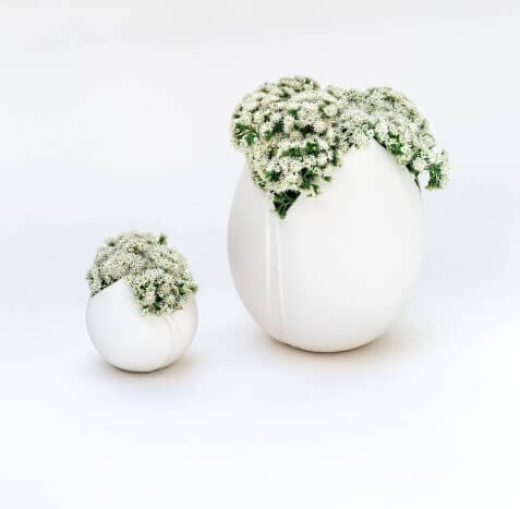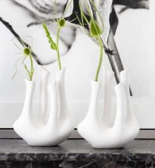 Le vase Tulipya en porcelaine biscuit a été soigneusement découpé à la main pour garantir la netteté des fines lignes sur les bords. J’utilise de la porcelaine biscuit pour obtenir l’aspect mat et représenter textuellement la matière première.