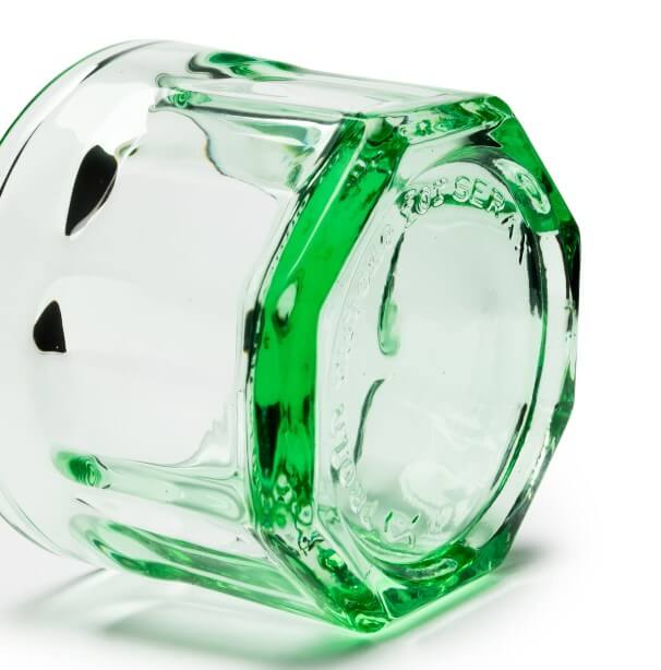 Verre en verrerie de couleur verte. Cette collection de service abordable et résistante en verre pressé convient parfaitement pour les apéritifs, les dégustations et les apéritifs dînatoires. Ce verre fait partie de la collection Fish & Fish glassware, de Paola Navone.